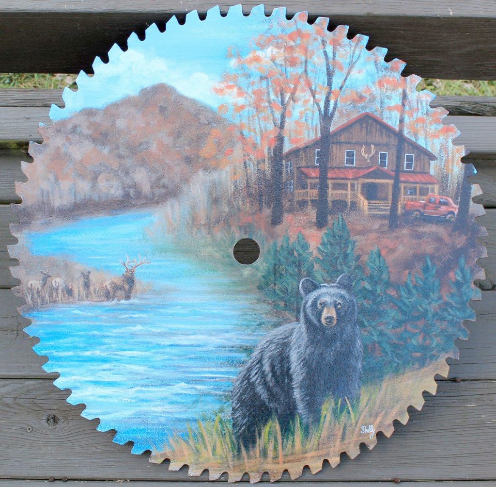 Her current work has a rustic feel, even her portraits, and reflects her love of the outdoors. Her wood burning creations are on natural lumber with the bark still attached and her other work focuses on nature: animals and landscapes are a very common in her art. “I love painting trees!” She says, with a laugh. “I don’t know if it’s just how it looks on the wood, but it’s just fun to me, doing the bark and leaves.”