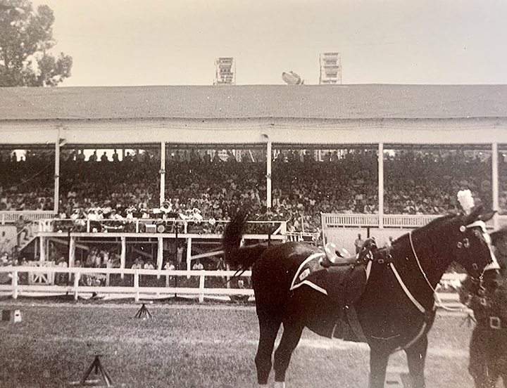 When the old grandstand at the Greene County Fairgrounds was taken down in 1986, this photo made the papers. I’ve added another photo to the story from 1959 that shows the grandstand in its heyday, every seat filled and standing room only for the State Police Rodeo. The grandly cursive writing on the back of this original photograph from Cornerstone Genealogical Society archives tells us that Andrew Jesalasky is with his horse. Only part of him is still there to be seen but the excitement of the day is captured in the restless energy of his horse’s tail, caught in mid-swish.