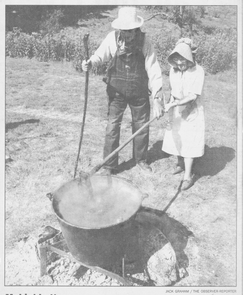 This photograph, saved from the September 15, 1995 edition of the Observer Reporter shows longtime Aleppo Grange member Joe McCracken and neighbor Sarah Morris “makin’ butter” in a copper kettle over an open fire. When done, the apple butter was jarred up and taken to Ryerson Station State Park for the second annual Arts in the Park Heritage Festival. Grangers were there before dawn on September 23, to light another fire and have a second batch bubbling before the crowds arrived to watch, schmooze and do some stirring themselves. By lunchtime every jar was sold, it’s that good. (I guess I can tell you now – our secret ingredient was a bag of red-hot cinnamon candy!) The straw hat and sunbonnet Joe and Sarah are wearing are a nod to the past for this 1995 photograph, but this is really how apple butter has been made since pioneer days – gallons of peeled and chopped apples, hours of stirring, the smell of wood smoke, the glow of Autumn all around.