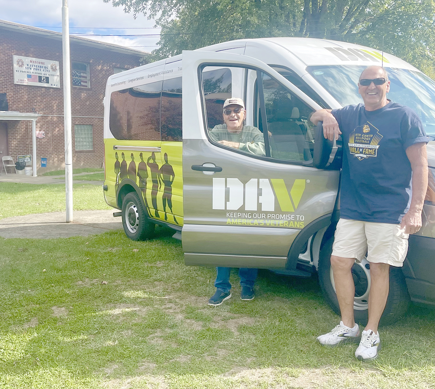 We’re standing by Greene County’s new transport system van with the national DAV logo on the door: “Keeping our promise to America’s Veterans.” Behind us is Waynesburg VFW Post 4793, where this newest free transport to doctor and hospital appointments parks when not on the road.
