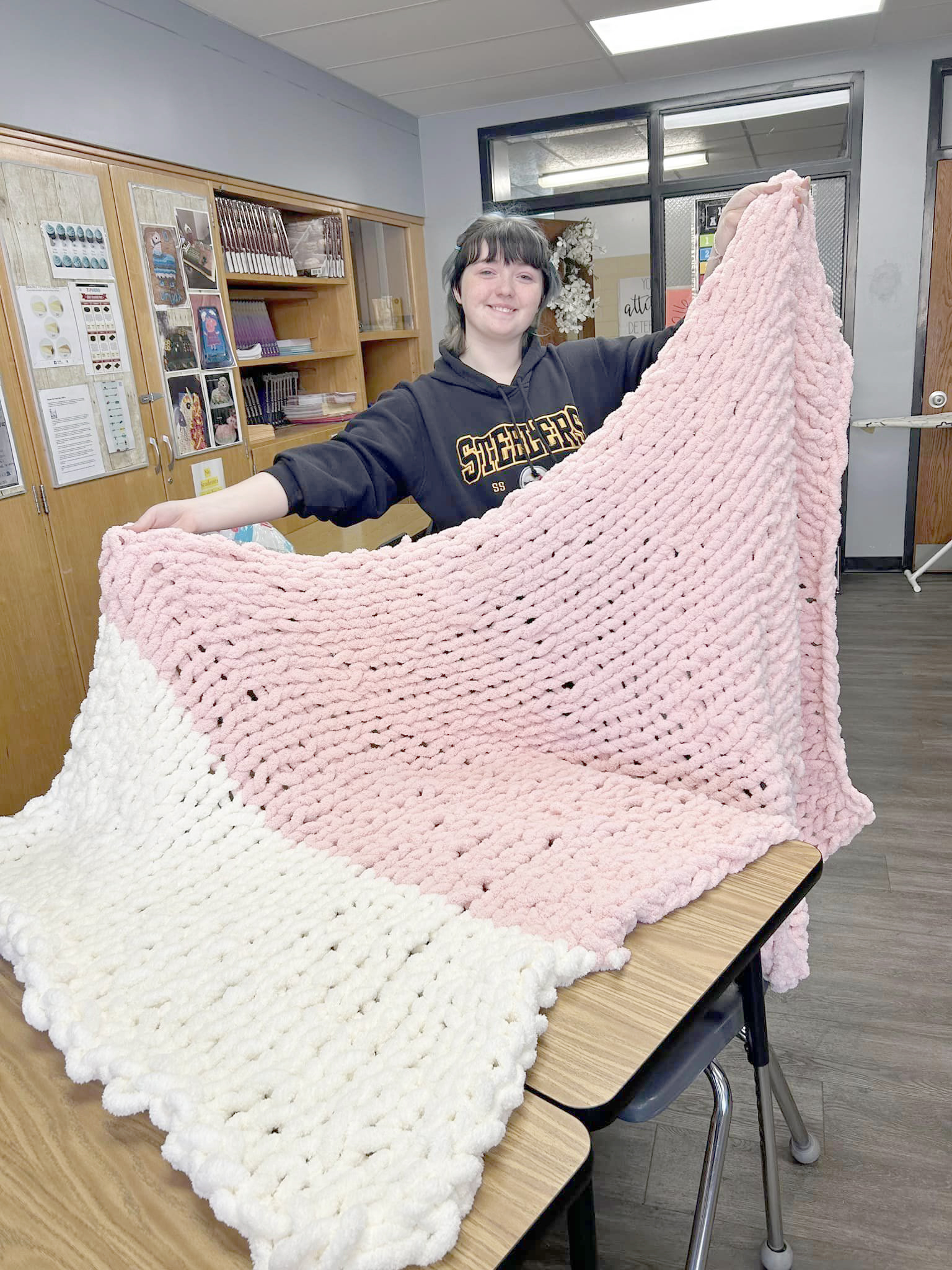 Each year the students complete an amazing seven projects. Some of the projects completed this year have been a hand blanket (using hands instead of a crochet hook), a tree skirt, an apron, a study pillow with pockets, and a tote bag. After the planned projects are completed, students are given an opportunity to work on a project of their choice if time allows.
