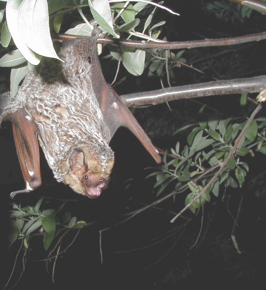 The largest bat in Pennsylvania, the hoary bat (Lasiurus cinereus) reaches lengths of 5.1 to 5.9 inches and has a 14.6-to-16.4-inch wingspan. The uncommon species has fur that is dark brown, tipped with white (hence the name hoary). They roost in trees, preferably conifers, approximately 12 to 40 feet above the ground, along forest edges, in woods, and around farmland. Hoary bats migrate in the winter and return in the spring.