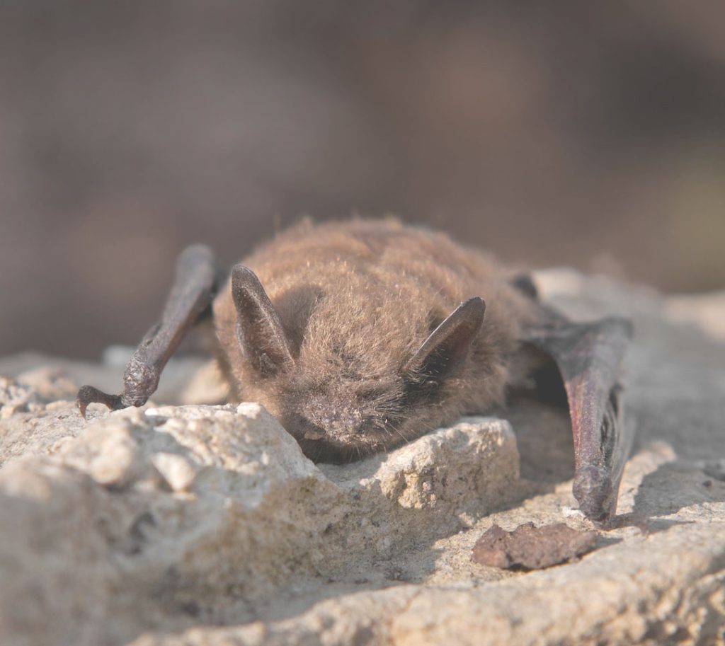 Until recently, the little brown bat (Myotis lucifigus) was considered one of the most common species of bat in America. Their glossy fur ranges from tan or reddish to dark brown, with black wings reaching 8.6 to 10.5 inches wide. Including their tail, they reach lengths of 3.1 to 3.7 inches. During hibernation, they leave their summer roosts of hollow trees, crevices, and dark buildings and move to tunnels, caves, and mine shafts. They emerge from hibernation in April or May and will often return to previous summer roosting sites.