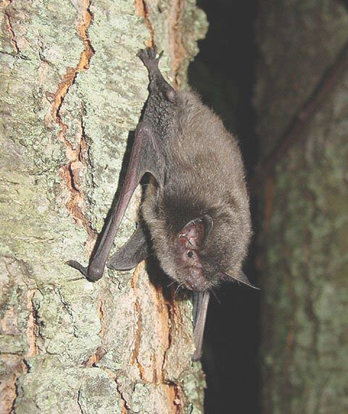 Formerly known as the eastern pipstrelle (Pipistrellus subflavus), the tri-colored bat (Perimyotis subflavus) was named for its distinct hair coloration: black at the base, yellow in the middle, and brown at the tips. The tri-color bat is one of the smallest bats in eastern North America and reaches a length of 2.9 to 3.5 inches, with a wingspan of 8.1 to 10,1 inches. They hibernate from September through April/May, deep inside caves. During the summer, they roost in open woods, near water, rock, or cliff crevices, as well as buildings and caves.