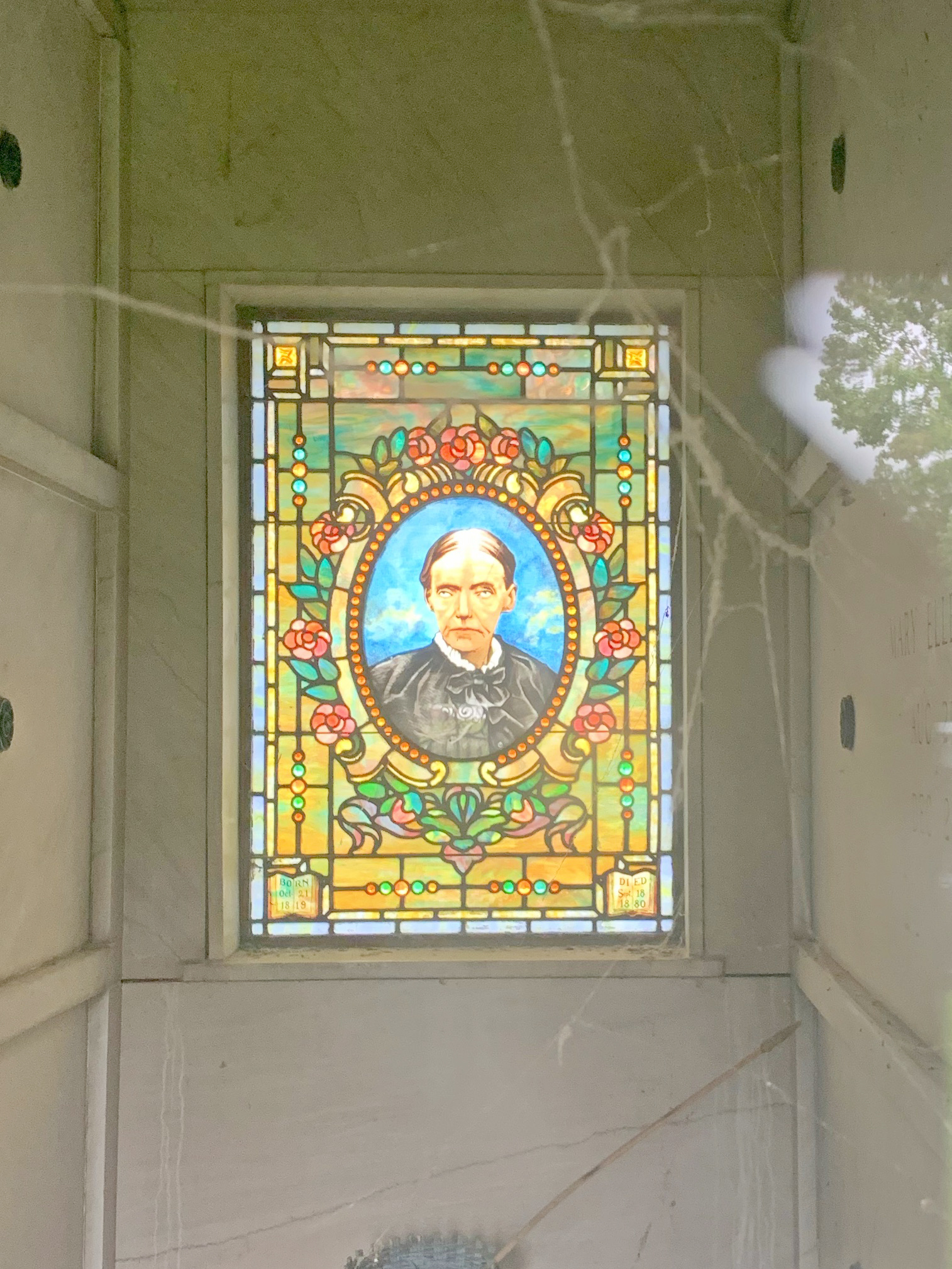 Martha Moor Martin was born on October 21, 1819, two hundred and two years ago this month. She was the daughter of Joseph and Mary (Schackleton) Moor and the wife of John McMyrtre Martin. Martha died on September 18, 1880. Martha’s sons, Joseph and James bought the lot in Greenmount Cemetery, where the mausoleum now stands on July 18, 1924, very soon after the sudden death of Joseph’s daughter Maud on July 12, 1924. Construction of the mausoleum began shortly thereafter. In commemoration of their dearly departed mother, Joseph and James had the stained-glass window created and installed in the mausoleum. Once the structure was completed, Martha’s body was exhumed and reinterred in one of the upper most sections of the tomb.