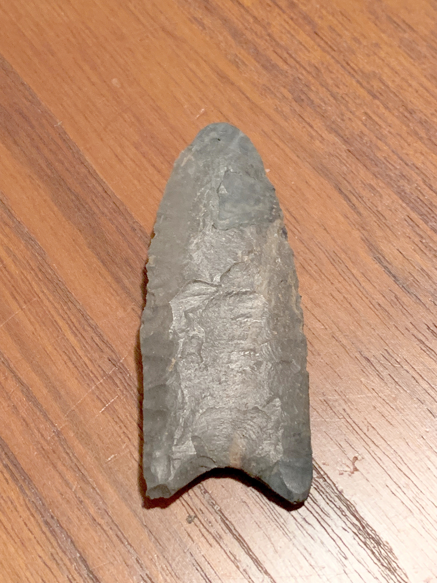 Shown here is a Clovis spear point typical of ones found throughout North and South America. These points are unique in their shape and the fluting up the base. The fluting is a thinning of the middle area, allowing it to more easily be attached to the end of a Spear. Though rare, many Clovis spear points have been found in Greene County.