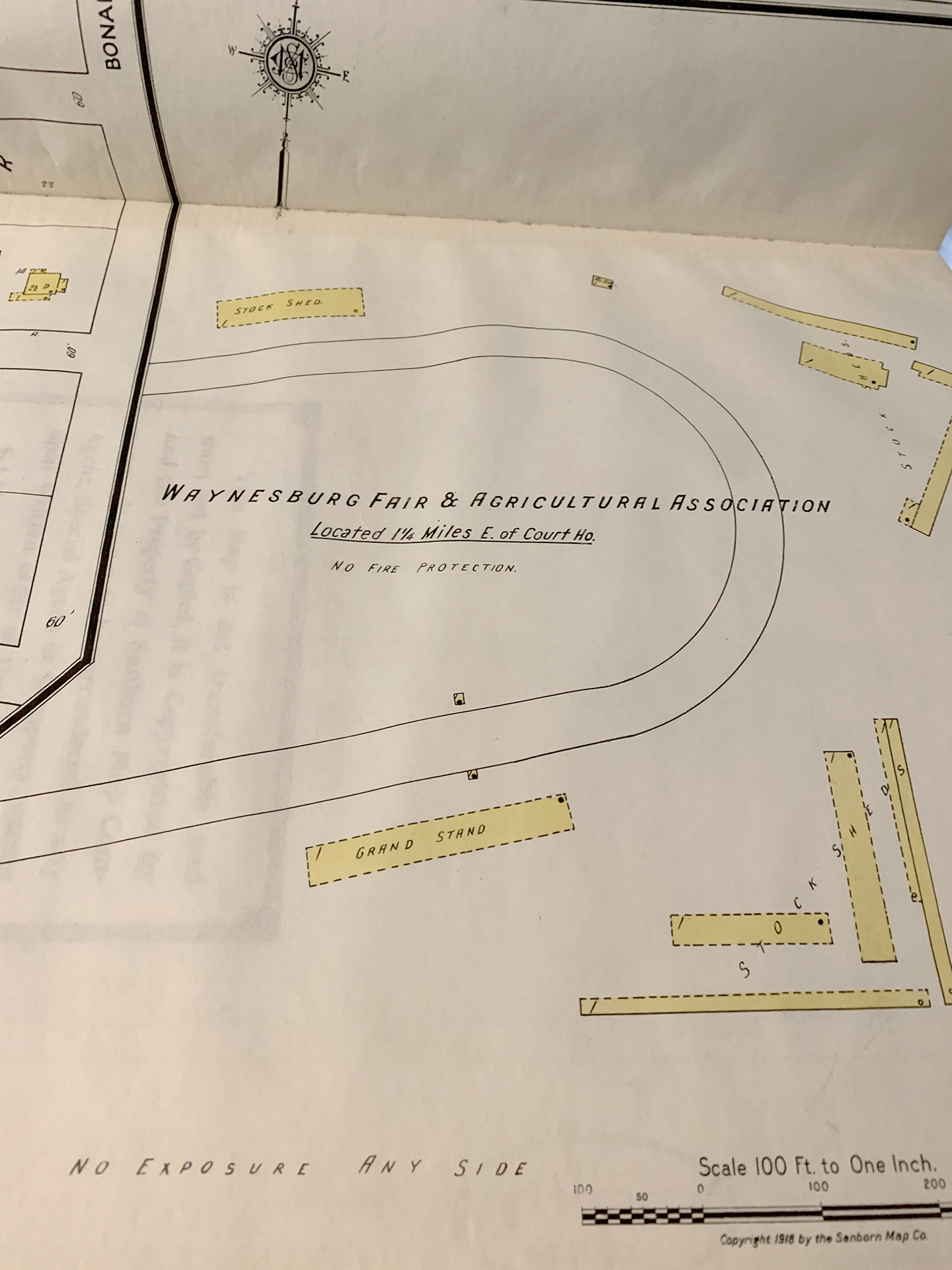 We can also track certain evolutions. In the 1918 Atlas, when looking at the area of town where Agway once was and where Waynesburg University’s Wiley Stadium now stands, we see what a former location of the Greene County Fairgrounds.