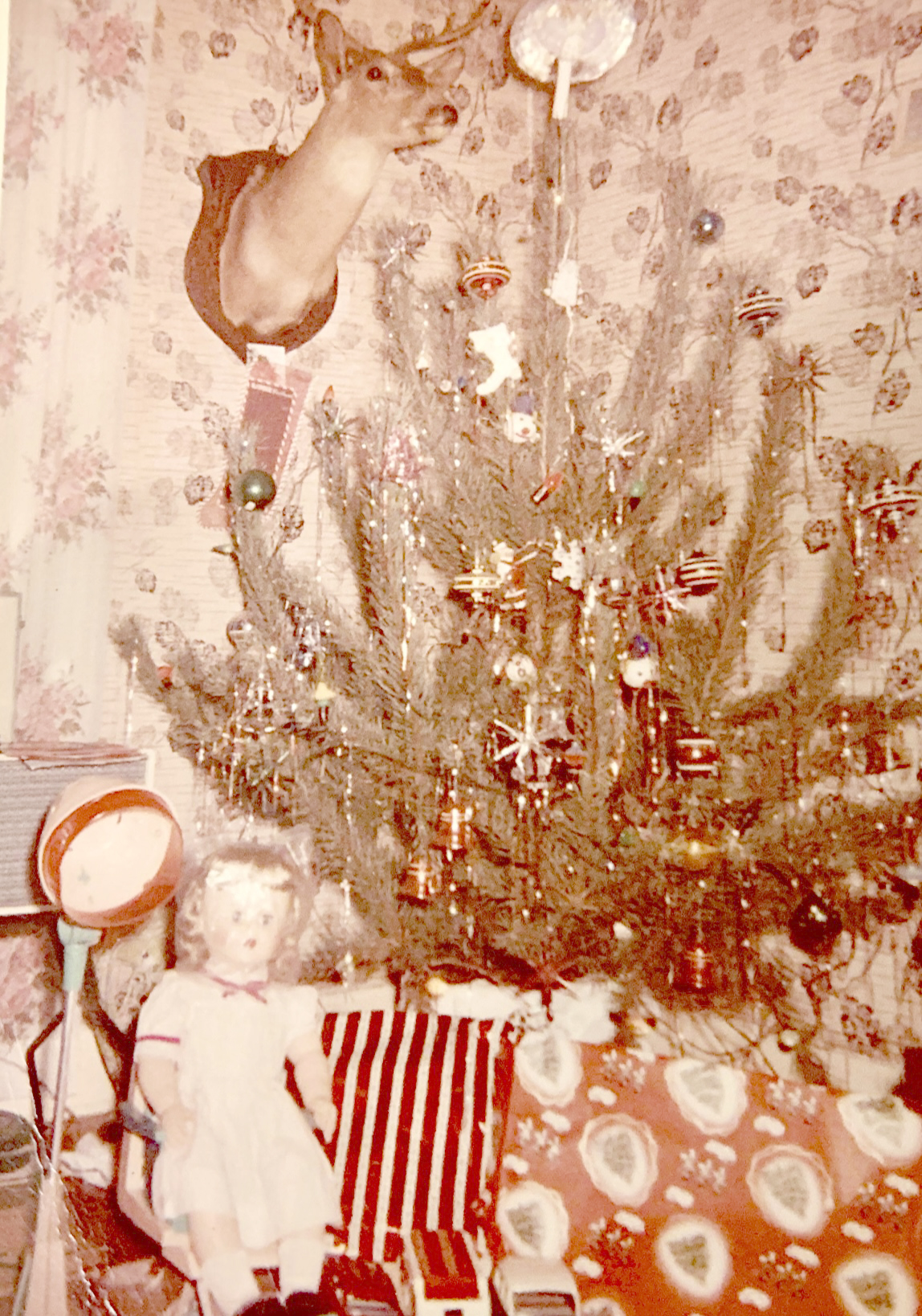 I found this blast from Christmas Past photo when I ran into Bridget on the Facebook group You were a Mather kid if you remember…..  Others got into the conversation as we posted. Of all the photos she sent me, I fell in love with the tree and its pie plate with the candle on top, the buck standing in for Rudolph on the wall and the beautiful glass ornaments so easily broken over the years. And the doll and her hair drier under the tree.