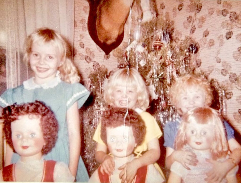 “Both were bought at the company store,” Bridget texts when she sent me family photos from that Christmas at Grandmother Arabelle’s. When presents were unwrapped, Uncle Rich and Uncle Harold stopped over and cousins Peggy and Cindy Moon were in from Virginia and cousin Carol Cain came from Ohio, to show off their what else? – new dolls.