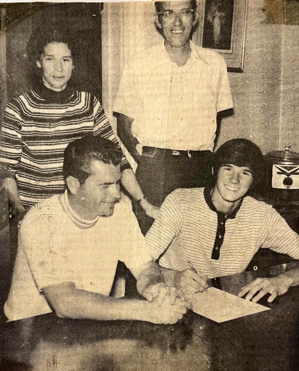 The cutline that came with the photo tells us this star player from Central Greene High School (class of 1971) has just signed a contract with the Chicago Cubs as part of their spring draft. The man beside him is Frank DeMoss, the Chicago scout who has recruited the “former Red Raider star.” Standing behind them are Danny’s parents, John Humble and his wife Bertha Mae of High Street in Waynesburg.