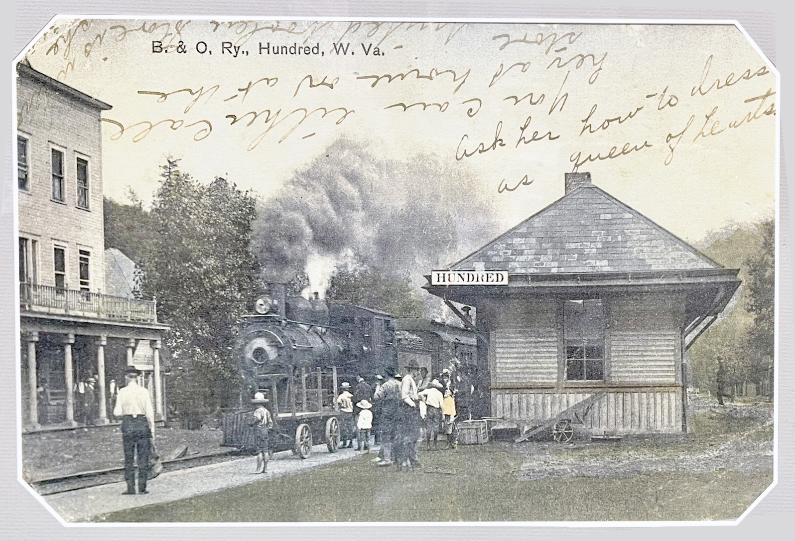 This crisply detailed old photograph might be a family print, with some scribbles still intact. “Ask her how to dress like the queen of hearts” brings up images of costume parties and happy faces; the colored shirts livening the platform and the tinted buildings and grass are touches someone gave to this frozen moment in time that make it feel like it was only yesterday we saw that plume of smoke roiling as the train pulled out of Hundred.