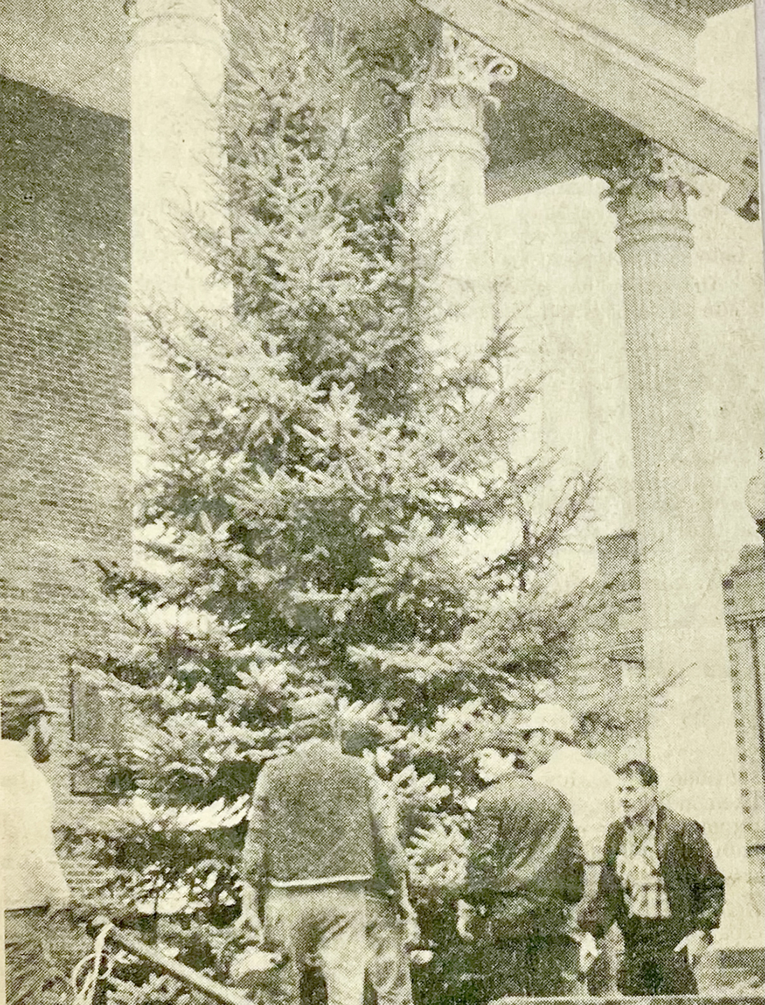 One of the photographs Harmon shared was of a gorgeous spruce on Nettle Hill that didn’t make the cut because it was too far from town. In another undated photo, that year’s tree wranglers can be seen posing amidst the cone-studded branches of the downed Norway spruce that would soon be on its way to town.