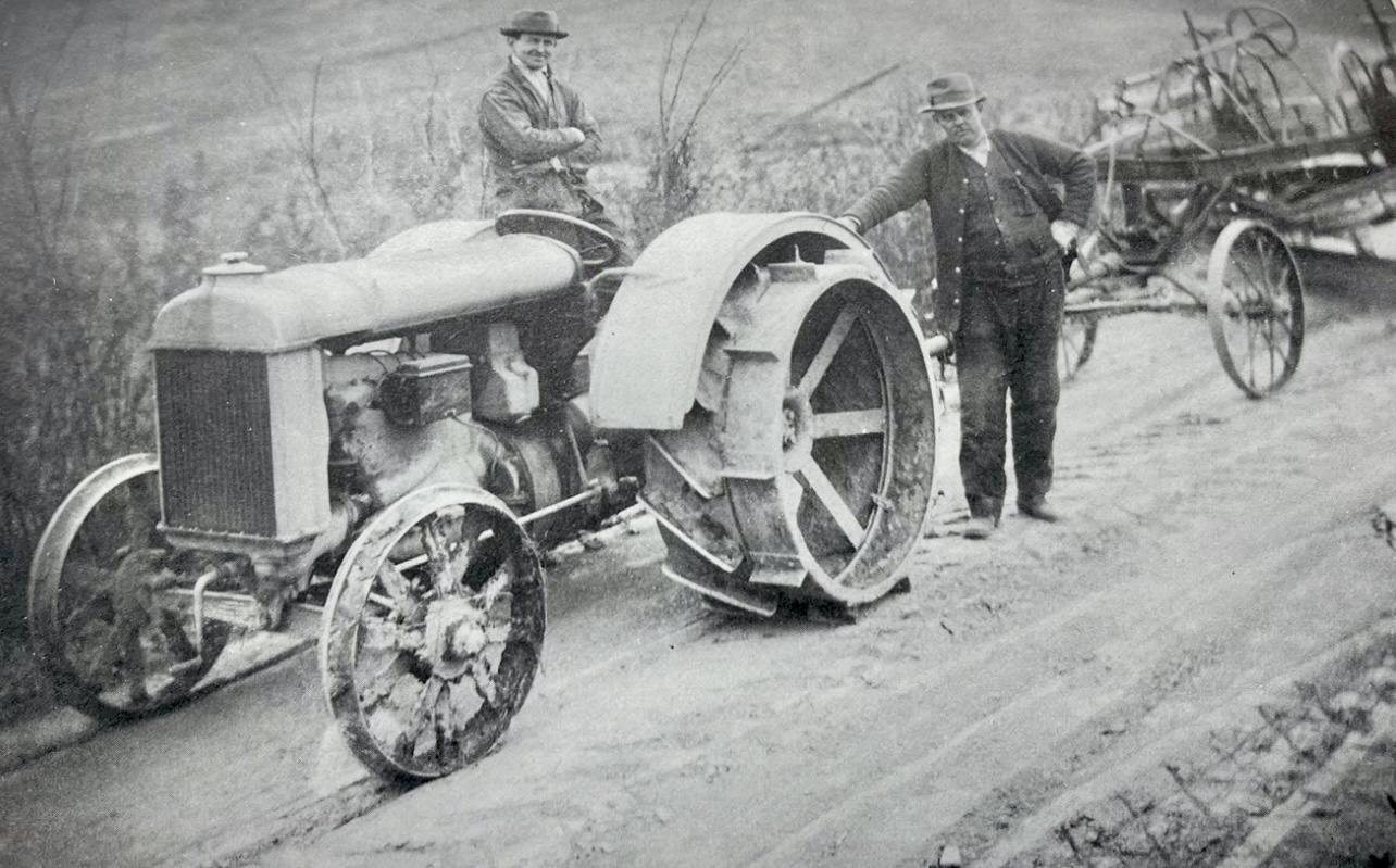 By now most farmers had vehicles but only a few had tractors, so the gnarly tractor-pulled road grader in this photograph would have been a welcome sight after weeks of wet weather as farmers brought in their crops and got ready to drive them to market.