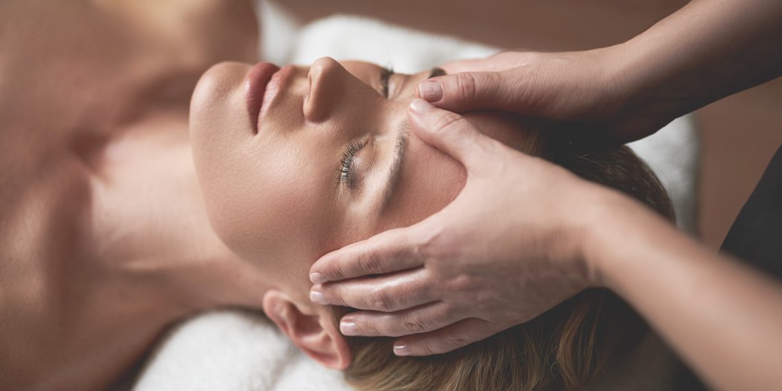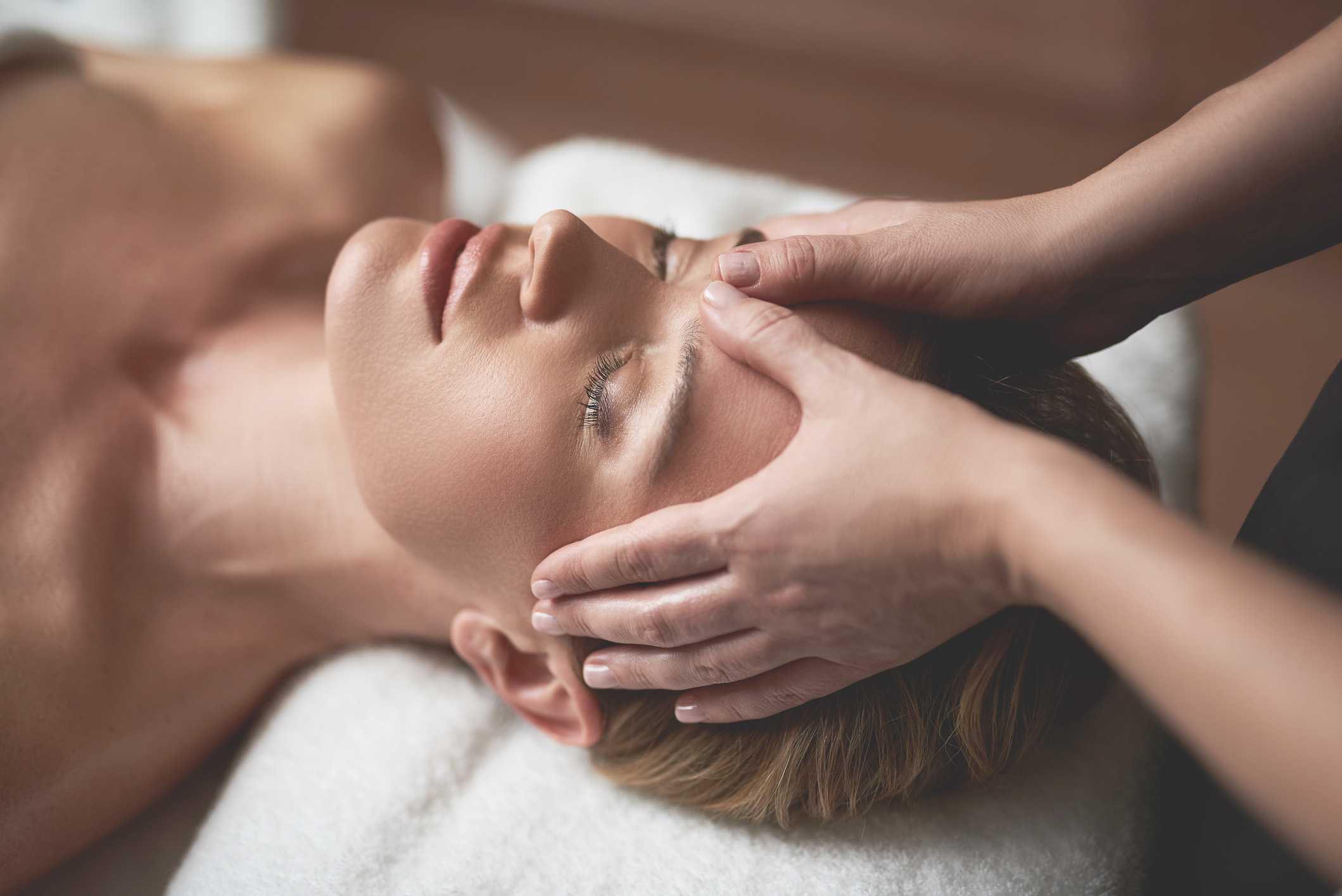 Concept of relaxation and body care. Top angle portrait of female therapist making anti-age massage of forehead wrinkles to young woman in spa salon