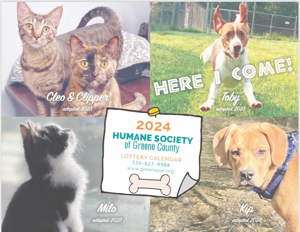 Now that we have entered the holiday season, the Humane Society is offering their yearly lottery calendar. The lottery calendar is the biggest fundraiser of the year, and a fun way to support the Humane Society. Every day offers a chance to win money! Every calendar has a three-digit number assigned to it and if your number is picked during the evening Pennsylvania Daily Number you will receive the amount of money assigned for that day. Prizes are mailed by check. Calendars can be purchased for $30 and are available to purchase online at www.greenepet.org or by calling 724-627-9988. Calendars can be picked up from the Humane Society or shipped, so this can also be a great gift for an out-of-town friend. It also makes a great gift for the impossible-to-shop-for friend.