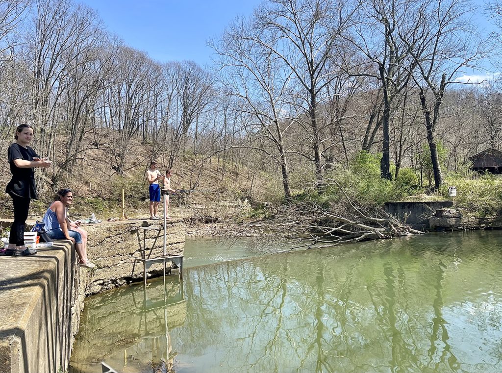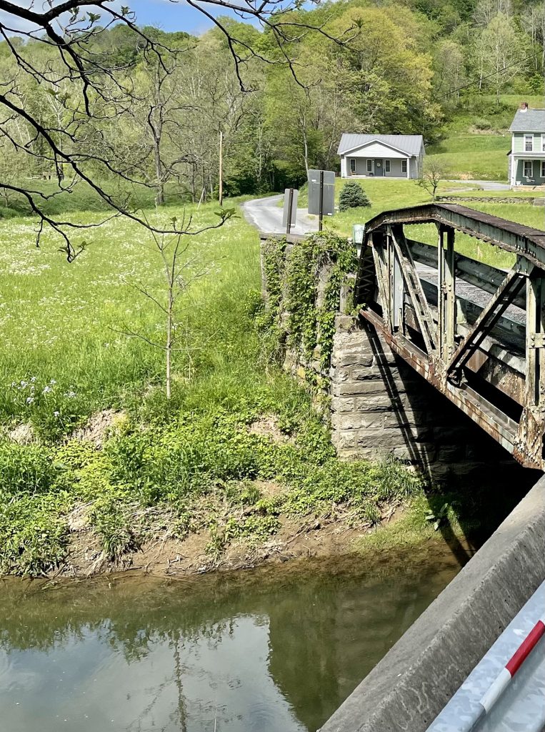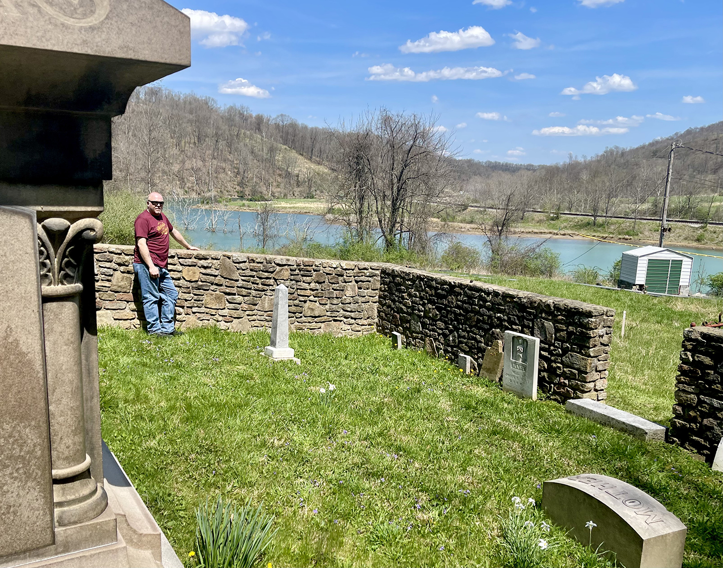 Mine Road follows the railroad tracks past a cluster of farms into a forgotten valley surrounded by steep wooded hills. Dunkard Creek was rerouted by the railroad to accommodate the tracks, turning a captured twist of stream into a sparkling body of water with a pavilion and dock for fishing. First built for mine workers, it is now a hidden treasure for those who know how to find it. This is where two cemeteries full of Matt’s relatives are tucked against the hill. The Cumberledge cemetery stones peek out from the branches of a fallen tree from a winter of ice and wind storms and Matt groaned then grinned – just another project for the kid who learned to love family history enough to become the county museum director and family artifact custodian, all in one.