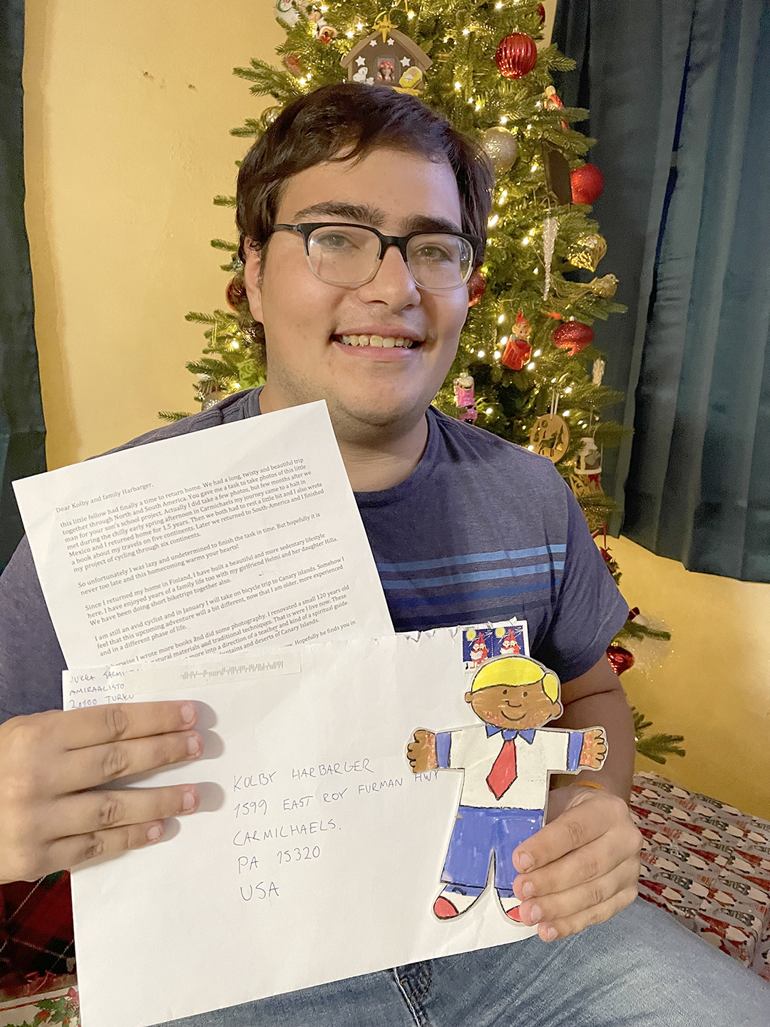Kolby remembers that he was eight and Flat Stanley was part of his home schooling things to do. Stanley was freshly colored and ready to go off on that adventure, so Jukka tucked him away, along with Kobey’s return address and peddled down the road.