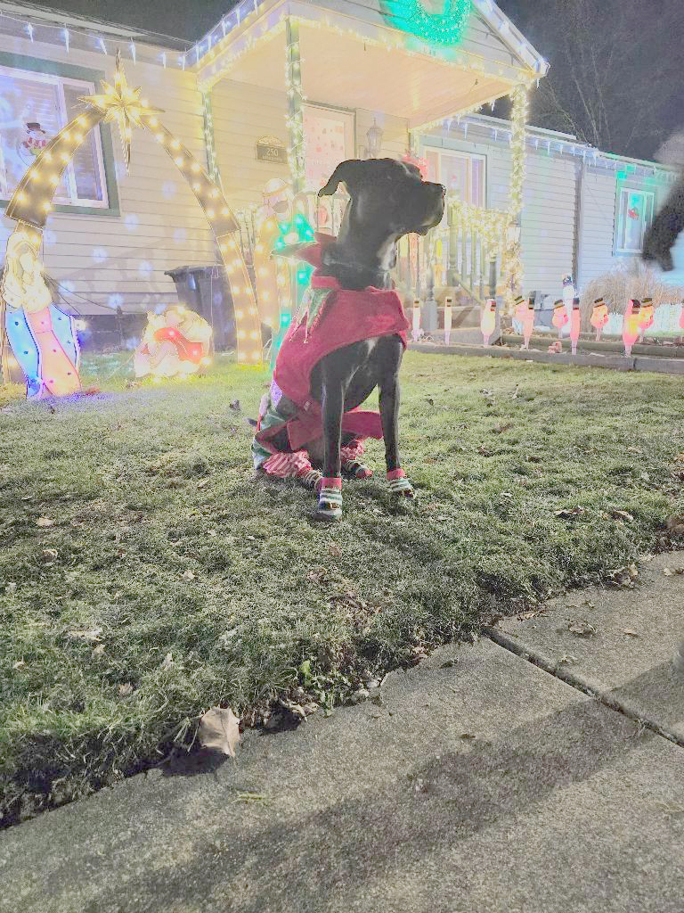 The event is a team effort involving the entire household. Beth is Mrs. Claus. Daughter Brenna and her husband Nathan, who’ve since moved in, help wherever needed, whether it’s handing out the cocoa and cookies, keeping Santa stocked with goody bags, or manning the burn barrels. Beth’s mother, Barbara Carney, buys ingredients for the sugar cookies, helps bake them, and dips hot cocoa. Even the dog, Coconut, has a role! “This time [2024] she was Jingles the Elf. The first year, she was a reindeer,” Beth relates.