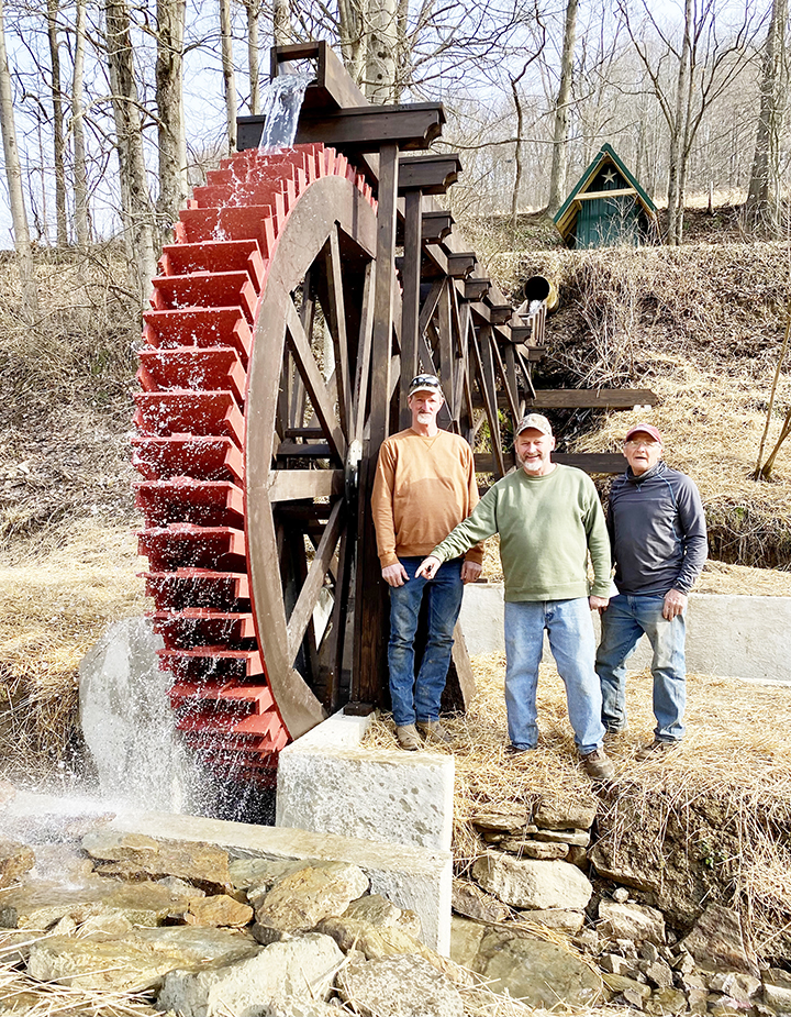 Adam checked out the designs Fritz Water Works Company uses, did his research and got to work on the project of a lifetime. Brothers Wilbur, Dean, Fred and Jacob came onboard and some neighbors and friends stopped by to help out. There were forms to be built for the concrete walls and wood to be bought for the wheel. Adam, a certified welder and steamfitter, fabricated the metal axle and fittings and shopped locally at Wayne Lumber and Hoys Concrete for building materials and the concrete pour.