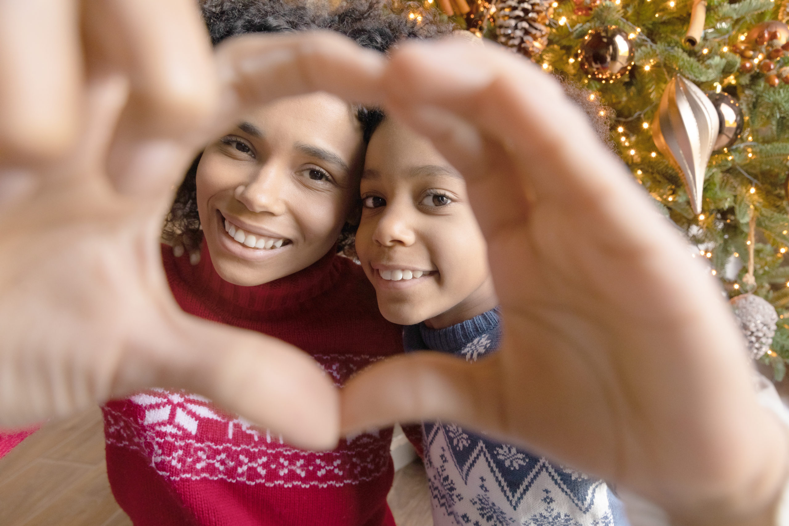Close up African American mother and adorable daughter wearing sweaters showing heart sign, looking through fingers at camera, taking selfie near Christmas tree, celebrating New Year at home