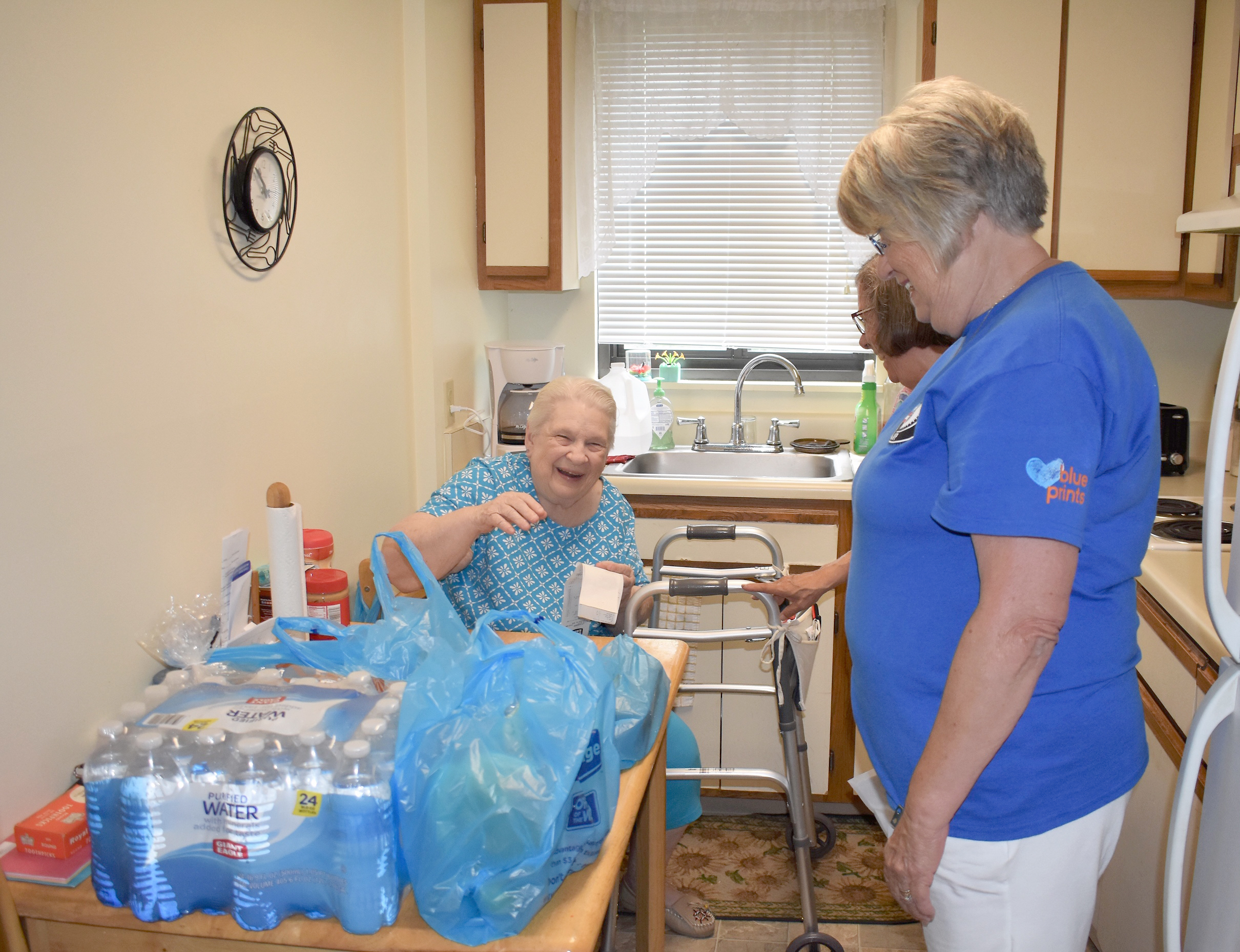 Myrtle Conard (sitting) receives her grocery delivery from volunteers Pat Phillips and Lisa Lewis (in back).