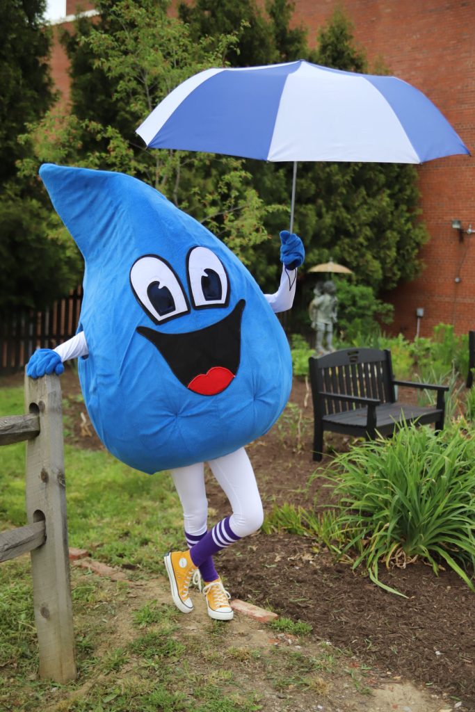 After years of inviting and hosting other local mascots, the Special Events committee began discussing the idea of creating and incorporating their own mascot into their event in 2015. After extensive research and finding a reasonable costume, the bright blue rain drop mascot was born. But what to do about a name? “We tossed around quite a few names, like Wayne Dwop, Rain Drop, and Wayne Drop. We decided to reach out to the public through social media for their name ideas. The consensus was Wayne Drop.”