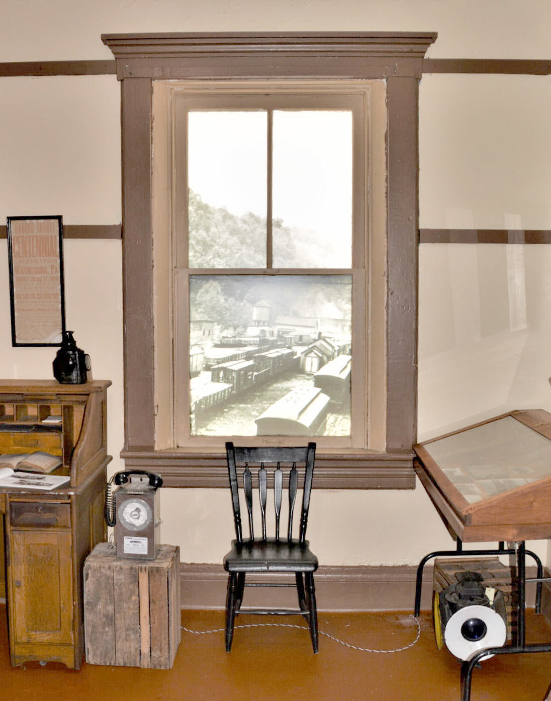 Our favorite feature, the room’s finishing touch, gives a sense of realism. A window covering, created by Direct Results makes it appear as if you are looking out the window into the W&W Railroad Yard. The original photo was taken from the attic window of J. Warren Jacobs right by the yard in the early 1900s.