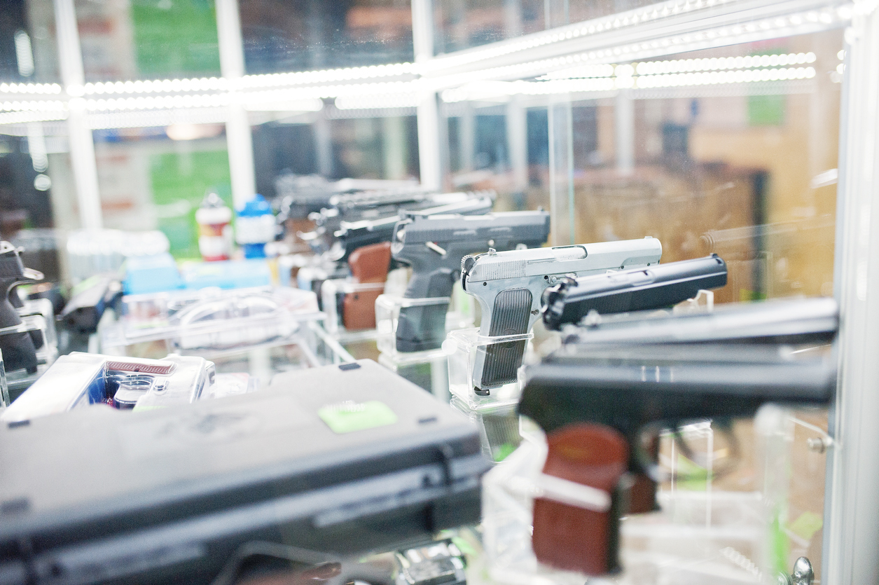 Different guns and revolvers on shelves store weapons on shop center.