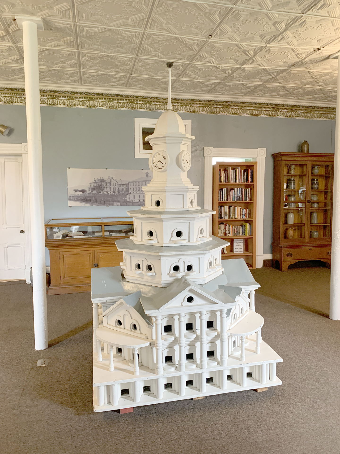 This specific Capitol Birdhouse was the last made by Jacobs — made to the original design specifications, whereas most models available by the 1940s had experienced some design changes. It was gifted to the Greene County Historical Society in 1959 and has been on display since 1984; it was refurbished by museum staff in 1990. Now it is a focal point in the main hall of the museum.