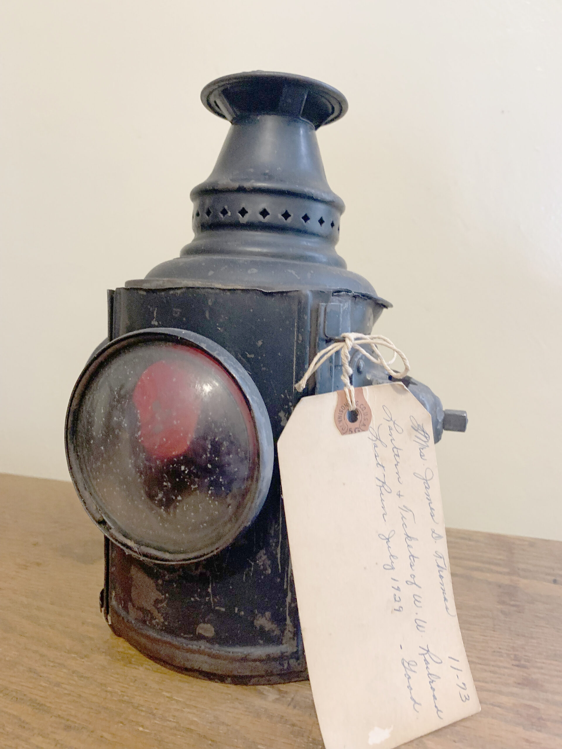 The caboose lantern was made by Dressell Lantern Company in the very early part of the 19th century. It is fueled by kerosene and has red and clear lenses to identify the parts of the caboose when lighting conditions are poor. This lantern was not intended to be “bright” in the sense that it would cast illumination to see or work but was designed to be more akin to a taillight on a modern vehicle.