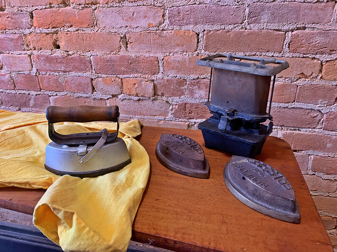 These later sad irons could use a designated heater to warm up the iron, also shown here in the photo. Kerosene powered these heaters, and they could often double as a small stove to cook on. Older sad irons were simply heated on the hearth stones near a cooking or heating fire.