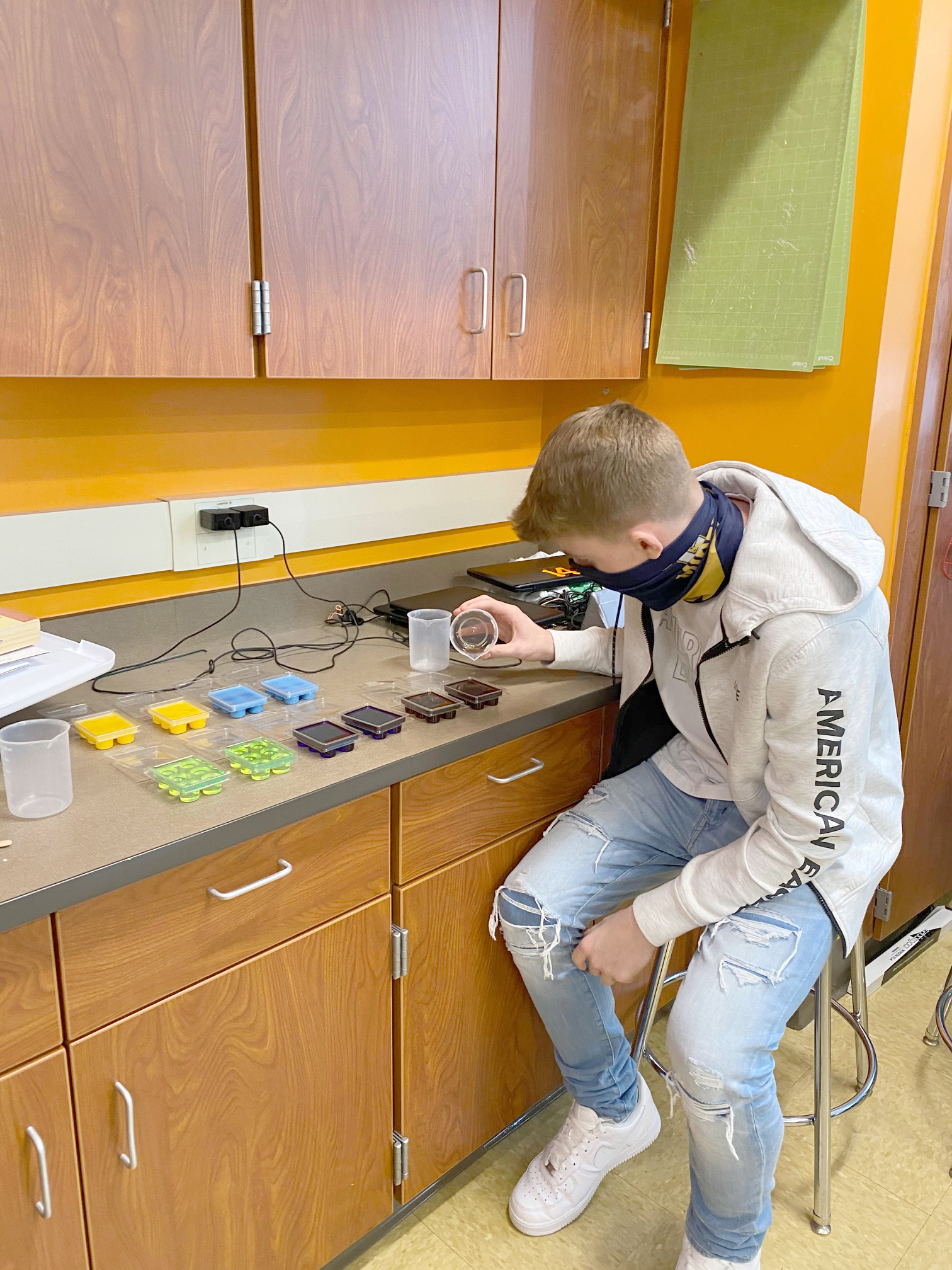 She adds, “I could not be more impressed with this group of students’ drive and dedication to their business… watching them naturally fall into roles that suit their strengths such as website designer, finance manager, production manager, sales team, etc.” The artwork for the wax tarts was digitally designed by two virtual students, Lily Bosle and Nathaniel Bercosky. Zachary Kerik and Alec Anderson serve as production managers, Levi Krampy is the financial manager and website designer, and Amber Wolfe and Rolin Burghy form the sublimation team. The sales team is made up of Nicholas Sholtis, Austin Walker and Sara Roscoe.