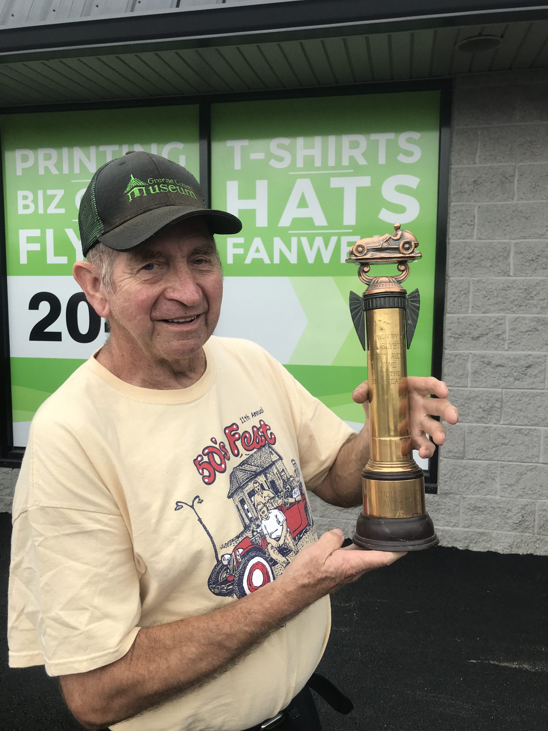 50s Fest tradition also offers a collectible magnetic dash plaque free to all participants and for sale to spectators as long as they last. This year’s magnet features a modified racecar owned by Bill Blystone, George “Bly” Blystone’s father. Bill Blystone was a member of the Bungholers, a collection of men who loved fast cars and racing. Bill lived for the thrill of racing. “I never really got to know him, but I have this great collection of pictures from my cousin, Grumpy Jim Donahue, who was also a Bungholer, my Uncle Gordy’s son – all relatives and friends – they were all into cars.” His modified racecar won the honor and trophy for having the fastest time at the Harper Dry Lakes, an abandoned Army facility in the desert, in Southern California in 1941. We’ll be sharing a little more about this car in an upcoming issue, so stay tuned…