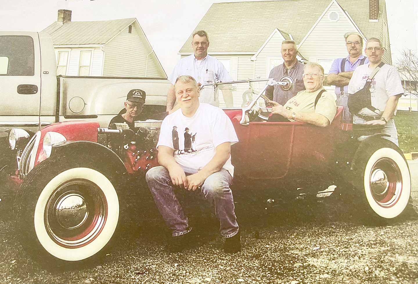 Glenn, a retired hydraulics engineer and salesman who got into building street rods and restoring vintage vehicles at his “hobby shop” garage in Waynesburg in 1996, doesn’t remember exactly what year he finished building this muscle machine. But he can tell you that it has a 1927 Model T body on a customized frame sporting a 1936 Ford front end, Chevy S-10 rear end and a 51 Ford Flat Head motor and transmission. He also knows the photo was taken for an article that appeared in the Greenesaver in 2006 – Bonnie has the clipping. And he remembers Greenesaver owner Shelly Brown who was involved in promoting 50’s Fest, calling in 2012, asking to use it for the 11th annual shirt. “She said it was getting late and they didn’t have any submissions,” so Glenn and his buddies got the spot of honor that year, with the image of George Kelley’s Point Auto Repair in the background.